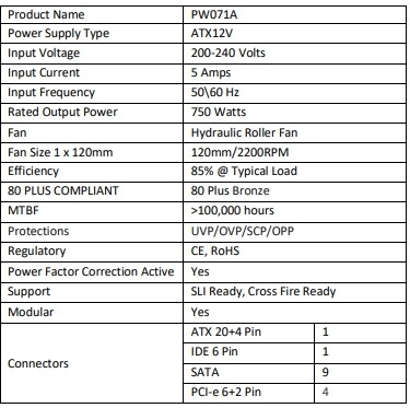 ● PW071A ดี ออกแบบโดยใช้ Power Factor Correction (PFC), 12V รางเดี่ยว และ LLC Resonant ต่อวงจรโดยควบคุมให้แรงดันกับกระแสไฟฟ้าอยู่ในค่าที่เหมาะสม ลดค่าความผิดเพี้ยนเพื่อให้ได้พลังงานสะอาด เสถียร และมีประสิทธิภาพสูง มากกว่า 90% (50% Load) ได้รับใบรับรองจาก 80 plus อย่างถูกต้อง